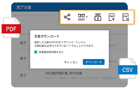 ● 文書内の入力データをCSV形式で出力することができます。出力したデータは顧客管理、契約管理、データ分析などのほか他のシステムとの連携にもお使いいただけます。